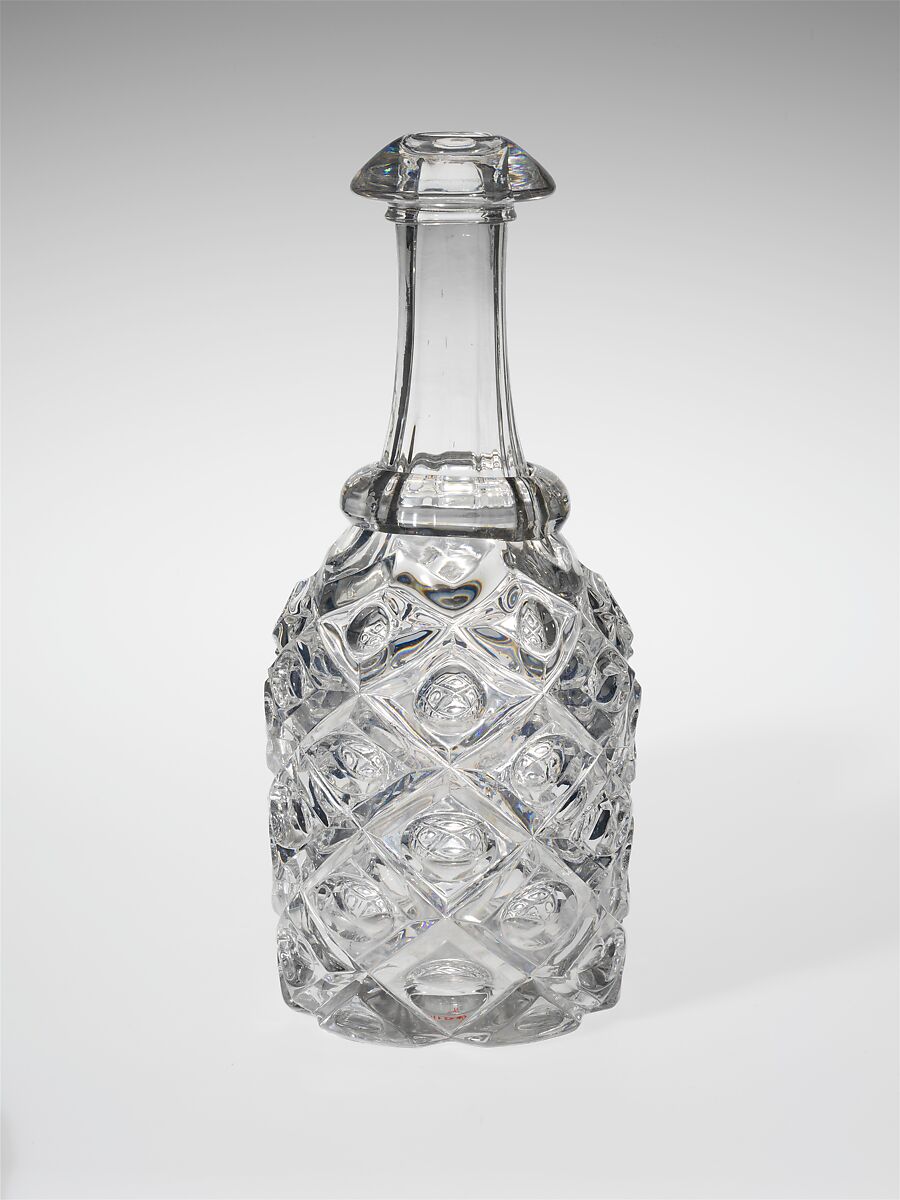 With the development of new formulas and techniques, glass-pressing technology had improved markedly by the late 1840s. By this time, pressed tablewares were being produced in large matching sets and innumerable forms. During the mid-1850s, colorless glass and simple geometric patterns dominated. Catering to the demand for moderately-priced dining wares, the glass industry in the United States expanded widely, and numerous factories supplied less expensive pressed glassware to the growing market. At the Exhibition of the Industry of All Nations at New York’s Crystal Palace in 1853, for example, the New England Glass Company exhibited 130 pieces of one design, "consisting of bowls, tumblers, champagnes, wines, and jelly glasses." This object belongs to one such service. Although the glass manufactory is not known, the glassware is very typical of the large services that were very popular with America’s middle class in the nineteenth century.
