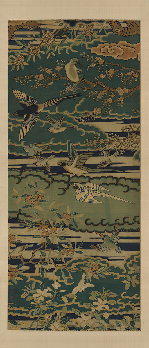 In this exuberant composition, various birds and plants are juxtaposed with cloud formations in colorful combinations. This tapestry was probably part of a larger decorative panel with hundreds of birds and a phoenix, a symbol of a group of loyal officials with a righteous ruler.