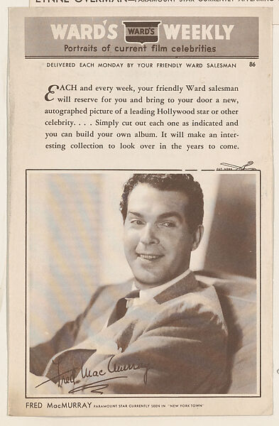 - Title: Fred MacMurray, bakery card from the Film Celebrities series (D31), issued by the Ward Baking Company