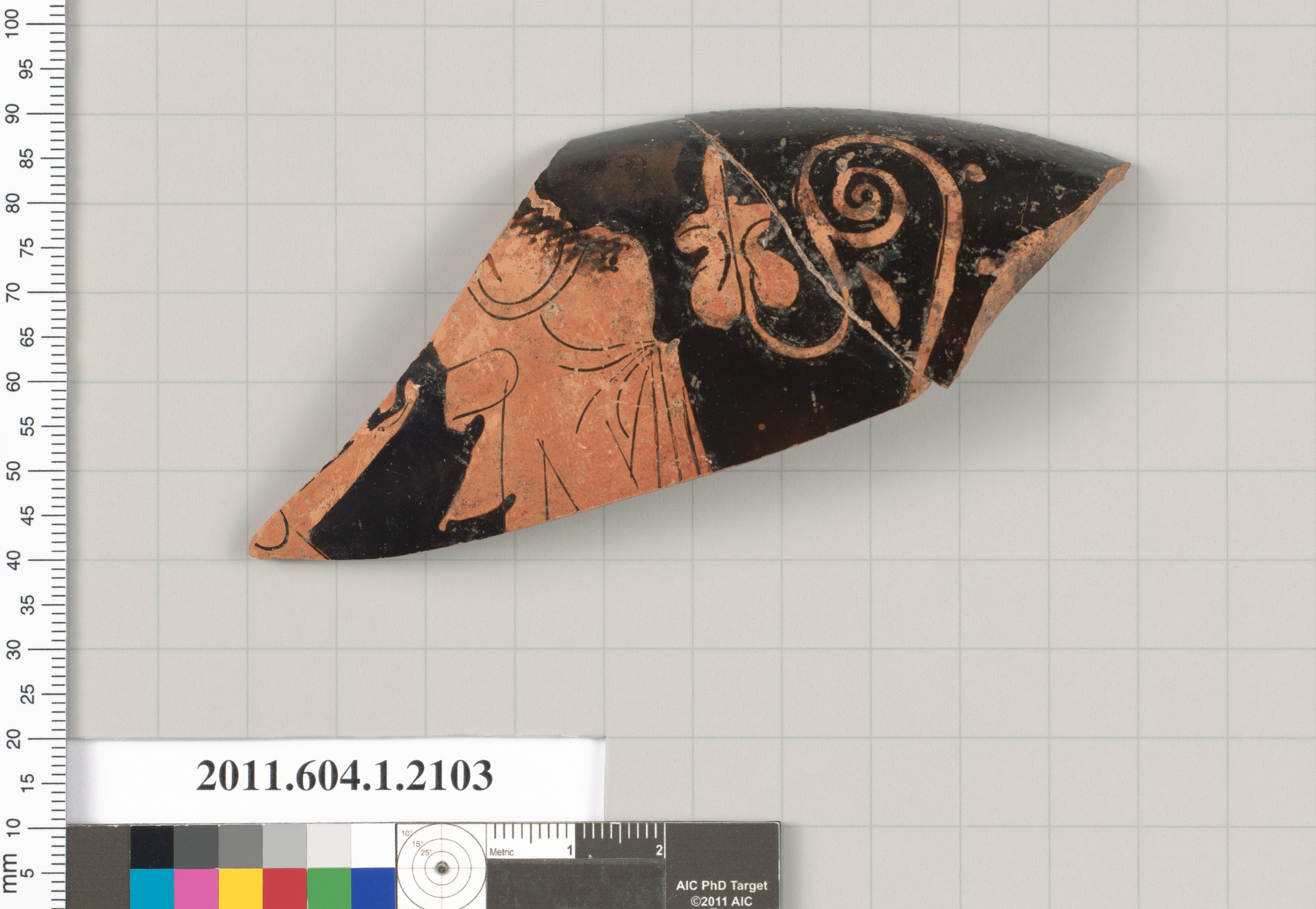 Exterior, on the left, unidentified subject, to the right, draped figure with long hair; volute and tendril
