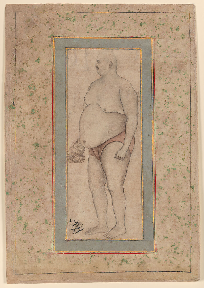 Pehlwani, a form of wrestling popular in South Asia, was developed during the Mughal Empire by combining centuries-old grappling traditions with Persian wrestling practice. The subject of this portrait has been identified as Chuk in nasta'liq script in the lower left. Chuk wears a loin cloth (langota) in the manner typical of Indian wrestlers. Although some of the lines in the lower part of the drawing appear to have been strengthened by a later hand, a fine brush is particularly visible on the wrestler’s aquiline nose, stubble, and tuft of hair at the crown of his head.