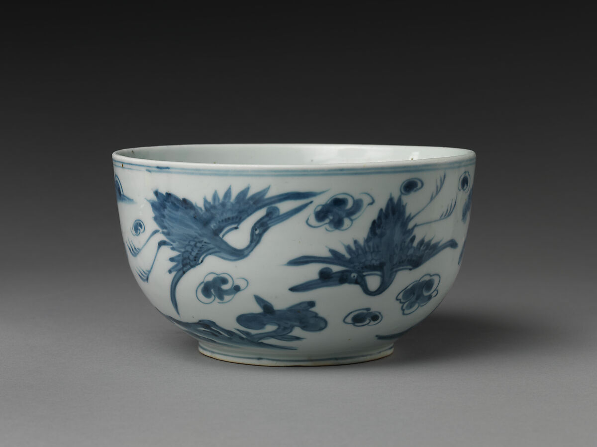 Embellishing the exterior of this deep bowl are ten symbols of longevity: pairs of turtles (with exaggerated streams of breath rising from their mouths), cranes, and deer; plants such as bamboo, pine trees, and mushrooms of immortality; water; mountain or rock; sun; and blossom-like clouds. The interior features a roundel with the stylized Chinese character for long life: 壽 (Korean: su).