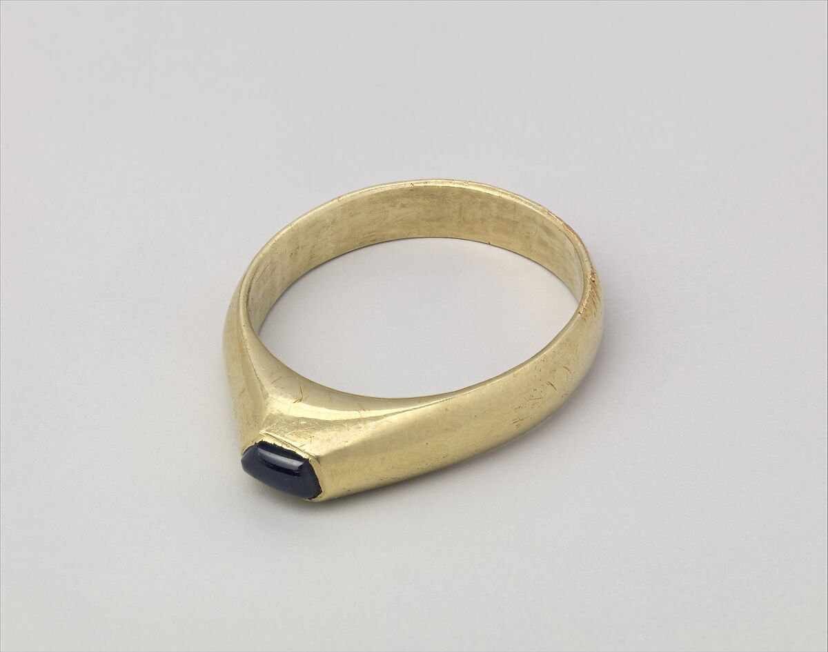 The stirrup ring, with its distinctive form that suggests both a horse stirrup and a gothic arch, was in fashion from the twelfth century well into the fourteenth century. They were most commonly set with a sapphire and worn by both clergy and laymen. The present example is distinguished by its elegant simplicity. Less heavy than rings found in the tombs of clerics, which were generally worn over gloves, this example was most likely the finger ornament of a layman.
