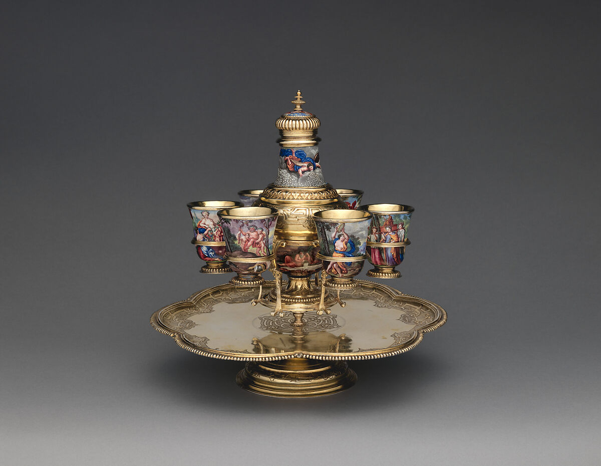 A designated master goldsmith from 1703, Elias Adam specialized in mounting miniature-like enameled ensembles and in seeking out new forms and ornaments. He was a key figure in the introduction of French late Baroque arabesques to Germany, where they came to be termed Bandelwerk.[2] The master cooperated numerous times with Johann Jacob Priester I, arguably the best enamel artist of his time in South Germany.[3] Adam’s highly original design for the present object represents the apex of how a great eighteenth- century goldsmith might convert already valuable silver and gold into an even more treasurable work of art. The form combines a tazza with a miniature monument to create a table ornament of supreme magnificence, in which the precious mounts augment the sumptuous nature of the enamels.
