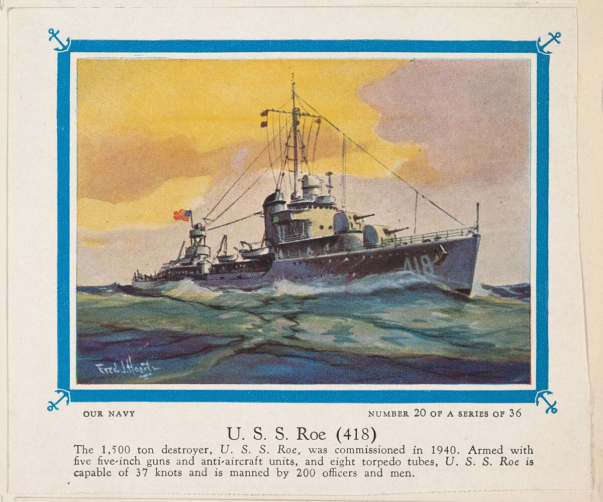 - Title: No. 20, U. S. S. Roe (418), collector card from the Our Navy series (D62), issued by the Kelley Baking Company