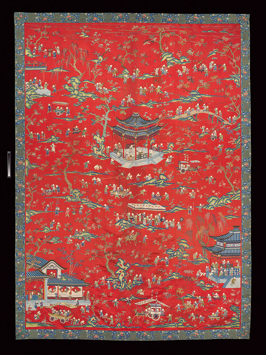 This large polychrome silk embroidery features a popular motif known as “the hundred boys.” To express the desire for a prosperous family, hundreds of male children at play are depicted, usually in a beautiful garden. Here, 250 boys are engaging in various activities, such as wrestling, hide and seek, butterfly catching, deer riding, and playing with a ball. Each child is embroidered in a different posture with simple but fluid outlines, which required not only intensive skill but also artistic sensibility. Hangings like this usually served as wall decorations in wedding celebrations.
