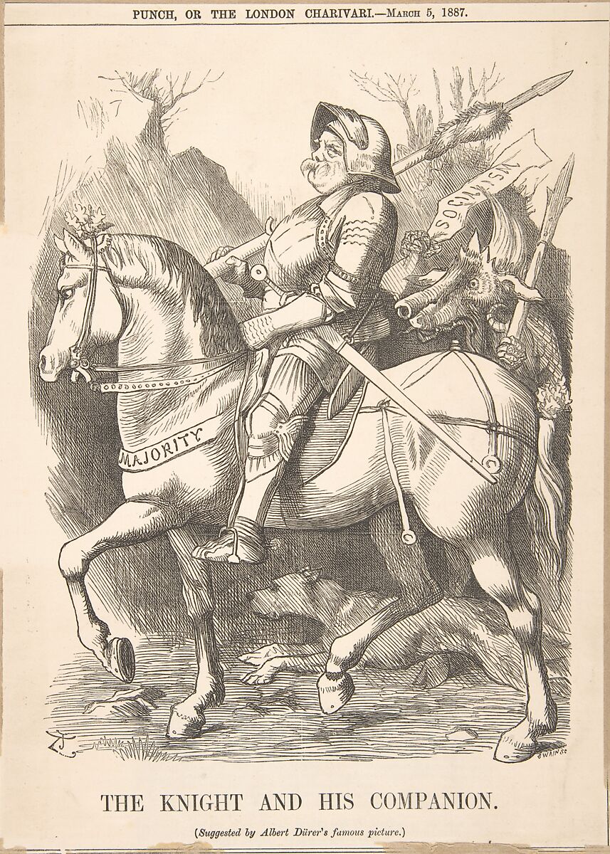Published in the periodical "Punch," this satire by Tenniel uses the imagery of Durer's "Knight, Death and the Devil" to comment on contemporary debates about socialism, elections and majority rule.