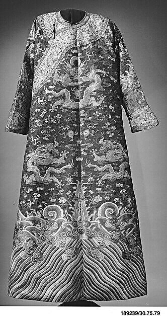 The unusual green tone of the robe derives from peacock feather filaments that were individually twisted by hand onto the threads used to embroider the garment. Robes made in this laborious fashion were valued both for the work entailed and for their exotic quality as the peacock is not native to China. Textual sources trace the use of peacock feather filaments to the fifth century. The earliest surviving examples are fragments unearthed from the tomb of Ming Emperor Wanli (1572–1620) in a suburb of Beijing in the 1950s. A robe similar to this one is now in the collection of the Palace Museum, Beijing.