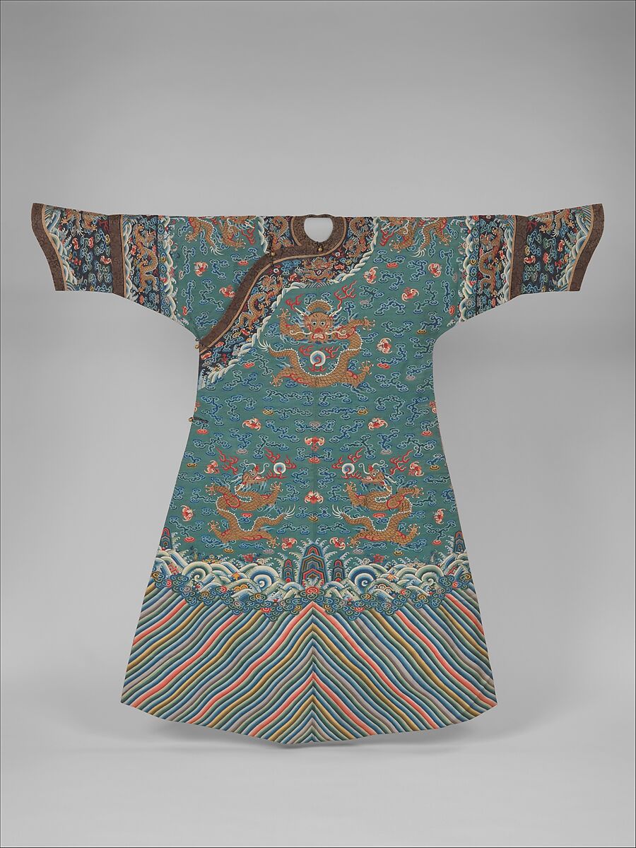 The golden five-clawed dragons on this robe indicate that it was woven for an empress or imperial consort of lower rank. While it retains the imagery mandated in the mid-eighteenth century court regulations, changes in the rendering of these designs help date this robe to the late nineteenth century. The heads of the dragons appear swollen and disproportionate to the bodies, and their claws have lost their strength. The standard rock and waves pattern at the hem have also changed. The diagonal waves are longer, straighter, and less realistic. These stylistic changes parallel those found on other works of art made at the same time.
