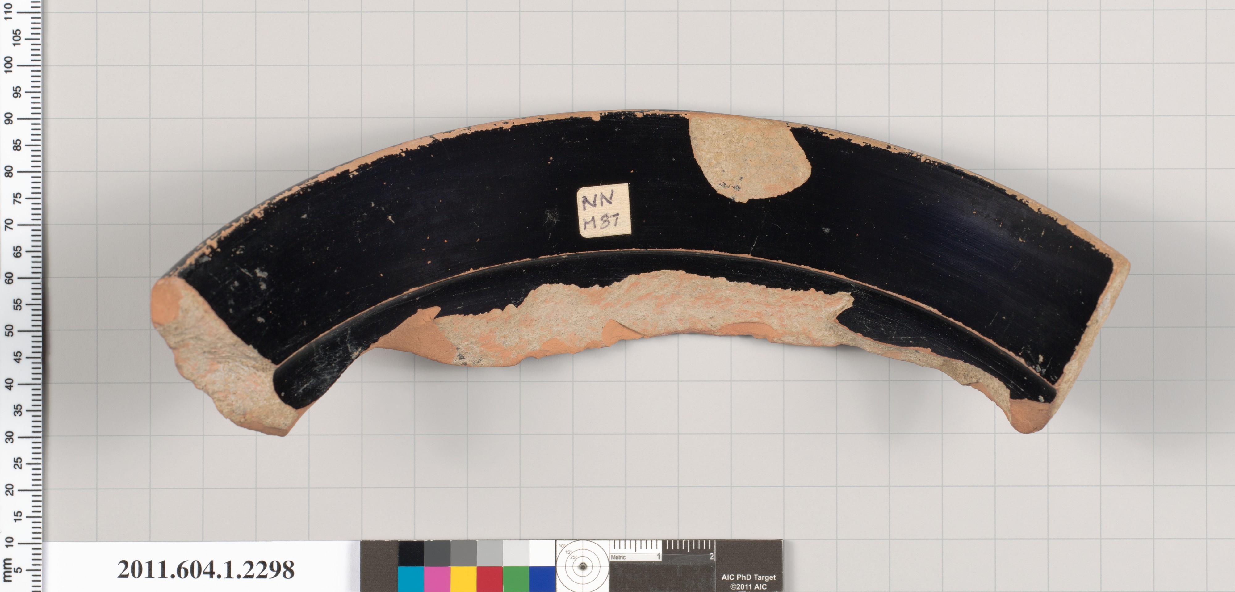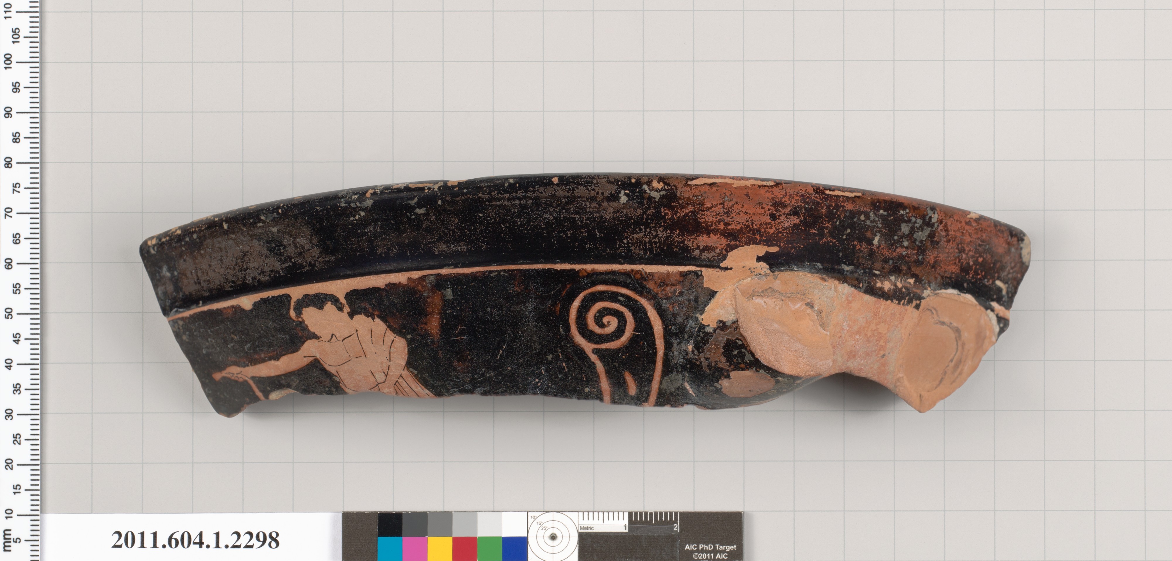 Exterior, head and upper torso of youth with himation, his right arm is extended and he holds a staff in his right hand; tendril and part of handle root