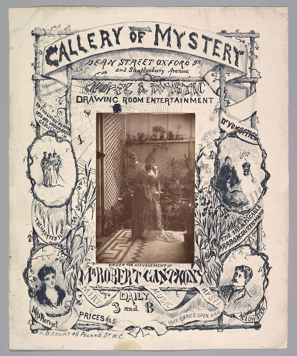 This photographic advertisement from London’s Gallery of Mystery illuminates the intimate connection between trick photography and the golden age of stage magic at the turn of the twentieth century. It was made to promote a drawing-room magic show presented by Robert Ganthony, a British stage illusionist and later the author of Bunkum Entertainments: Being a Collection of Original Laughable Skits on Conjuring, Physiognomy, Juggling, Performing Fleas, Waxworms . . . Etc. (1922). At the poster’s center is a photograph purporting to illustrate the "gradual transformation of two living persons, Miss Florizel and Mr. Lowater, into one under bright gaslight in the haunted flat." Doubling—two figures merging into one, or a single figure appearing multiple times—was at the time an extremely popular motif in both theatrical magic and trick photography.