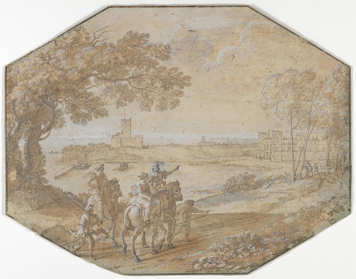 This sheet is one of a pair of presentation drawings made for Pope Urban VIII who commissioned from the artist a pair of small octagonal paintings on copper depicting sites associated with papal building projects. This one relates to a painting at the Petit Palais, Paris, Coast Scene with the Port of Santa Marinella (PDUT872), of the same size as the drawing. The pendant, Coast Scene with a View of Civitavecchia was not executed in oil. The subject seems to have been replaced by Pastoral Landscape with Lake Albano and Castel Gandolfo, known through a painting in the Fitzwilliam Museum, Cambridge (PD.950-1963).