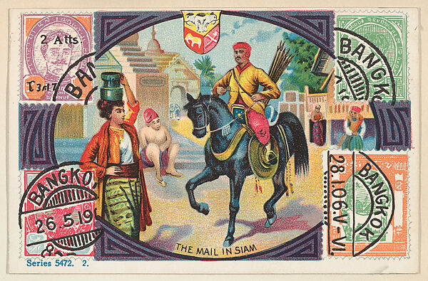 - Title:The Mail in Siam, bakery card from the Stamps and Mail Carriers of All Nations series (D73), issued by the Rochester Baking Company