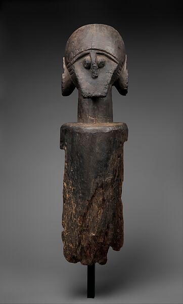 This enigmatic and arresting creation of a Jukun sculptor active in central Nigeria’s Benue River Region was a kinetic ancestral sculpture. According to accounts gathered by researchers, such works were animated in performances devoted to agricultural rites as well as to those relating to initiation of young boys into adulthood. Access to those events was highly circumscribed. Women, children, and outsiders were not allowed to view those nocturnal apparitions.