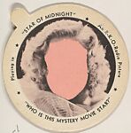Lid with tab from the Movie Stars series (small mystery lid) (F4), issued by Dixie Cup of the Individual Drinking Cup Company, Inc. as a lid for personal cups of ice cream. Distributed by multiple companies. In 1934, three versions of lids were issued with one wine colored, one blue colored and one a set of Mystery Lids on which the face of a movie star is blanked out in pink and their name removed. The consumer is to solve the identity of the unknown star.