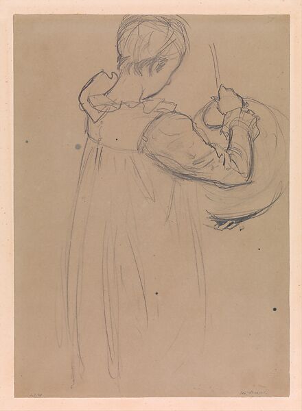 On this double-sided sheet, Sargent confidently captures the near final poses of young models Dorothy and Polly Barnard as they appear in his monumental exhibition painting Carnation, Lily, Lily, Rose (1885–86, Tate, United Kingdom). In these rapid sketches, Sargent varies the strength and darkness of his pencil, paying particular attention to the position of the girls’ arms as they light their lanterns.