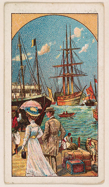 In the harbour of Suez, Departure on board an Austrian-Lloyd liner, bakery card from the Around the World Series (D92), issued by the White Star Bakery and included in Potato Yeast Bread. This set of cards also exists as series C41, issued by U. S. (Album 307, page 118)