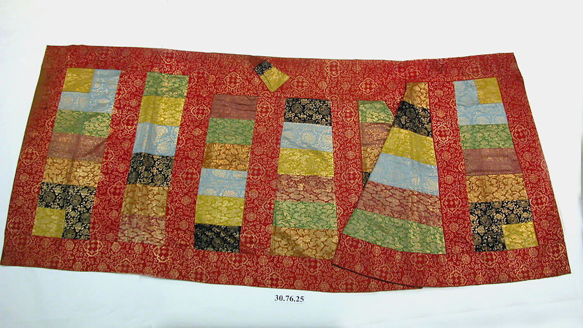 This type of robe, known as a kasaya and intended for a Buddhist priest, is a piece of rectangular fabric that is wrapped over an inner robe and fastened in the front with a hook. The lining of this example bears a stamp that reads “Used in the Grand Theatre (Daxiji yong),” which indicates the robe was worn by an actor in the imperial theater in the Forbidden City rather than by an actual priest.
