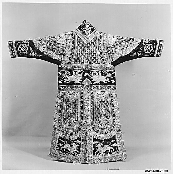This costume, for the role of a guard, mimics armor. Animal heads decorate the geometric armorlike pattern at the shoulder and thigh. Unusual winged animals appear at the waist, powerful tigers at the hem. A similar costume, in white, is in the Qing court collection of theatrical costumes of the Palace Museum, Beijing.