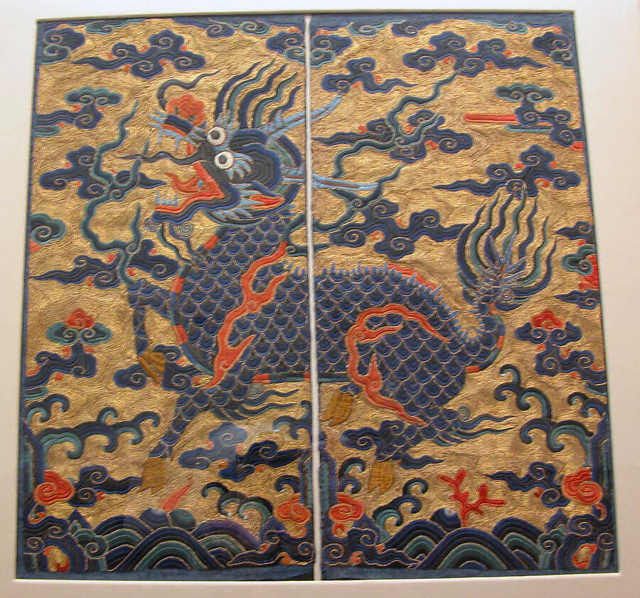 The qilin is a fantastic animal shown here in its conventional form. The flames shooting from the creature's body signify its supernatural powers. After 1662 the qilin became the insignia of military officials of the first rank; before that time it was worn by nobles.
