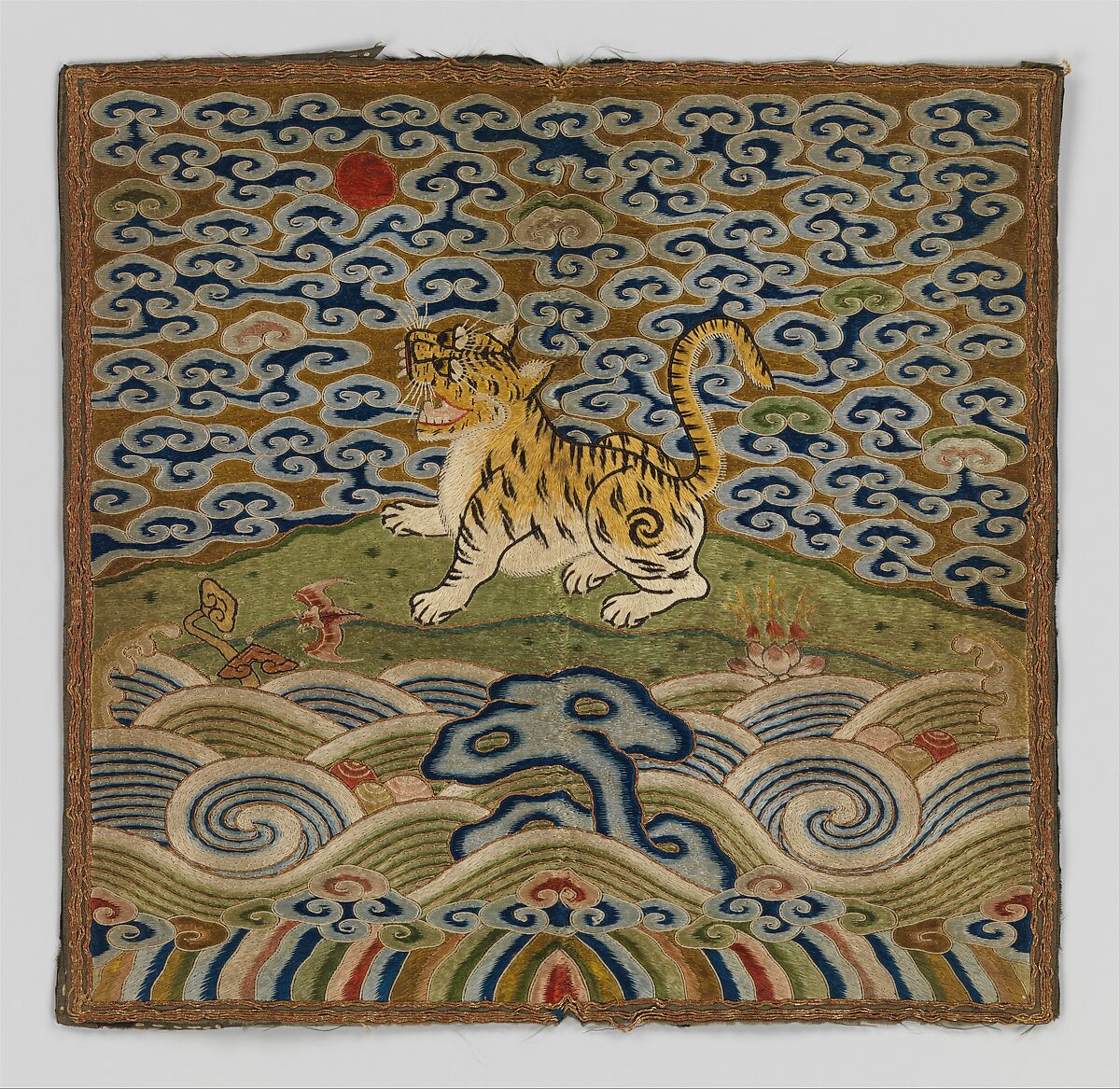 Government officials of the Ming and Qing dynasties wore square badges sewn on the front of their robes. These badges were embroidered with birds for civil officials and animals for military officers—each creature corresponding to a specific rank. A symbol of authority and bravery, the tiger adorned the badge of a senior commander (Rank 3) in the Ming and that of a regimental vice commander (Rank 4) in the Qing.