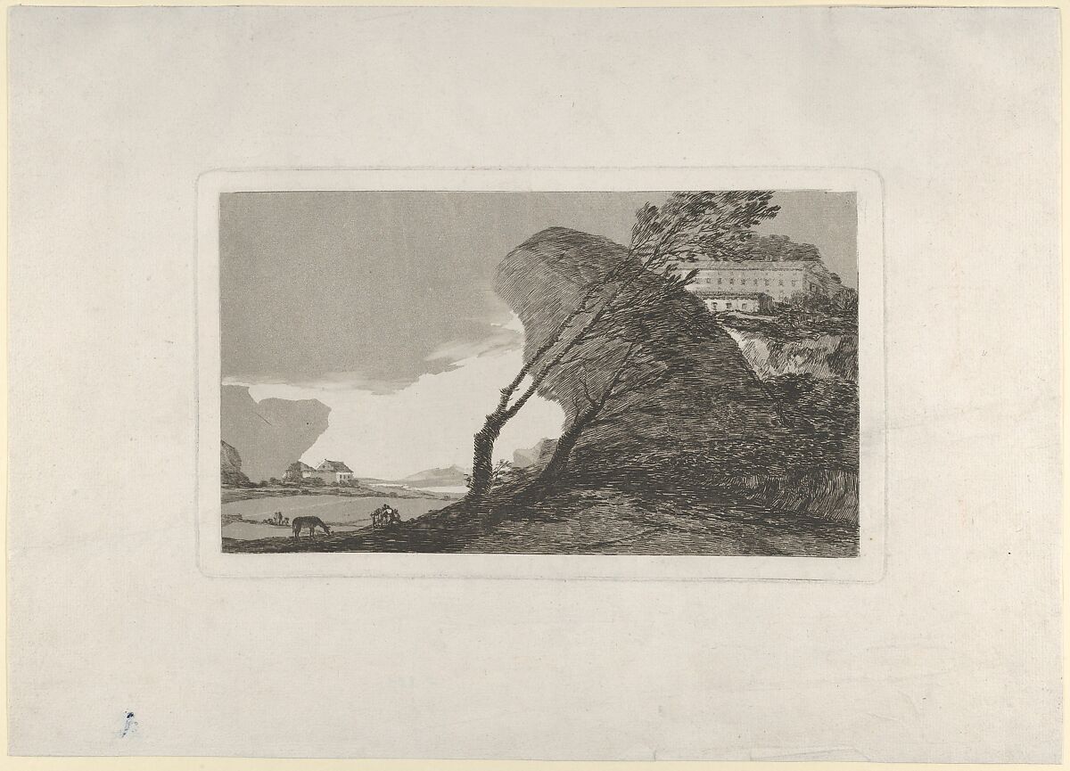 The print is of great rarity. It is one of only four known impressions printed by Goya in his lifetime. The other impressions are in the Biblioteca Nacional, Madrid, The Art Institute in Chicago and a private collection in Berlin. Within the context of his work, the Landscape sits at an important juncture. It was made after his major series of prints 'Los Caprichos' (1799) and before the 'Disasters of War' (ca. 1810-15). As such, it was produced when Goya was experimenting with individual subjects – not part of a series – and finds parallels with this other work from around the same time. The print was not meant for wide distribution and very few impressions were printed. The personal and somewhat introspective nature of is subject is key to understanding the direction Goya was moving in before the outbreak of the Peninsular War. The composition of the landscape is both balanced and precarious. Imposing natural forms loom over the diminutive figures in the foreground—a disquieting juxtaposition. The print might be interpreted as embodying the calm before the storm, when a foreboding presence threatens to overpower unsuspecting victims. It might therefore capture the fearful anticipation of the invasion by Napoleon’s army, who entered Portugal in 1807 before moving to Spain the following year.