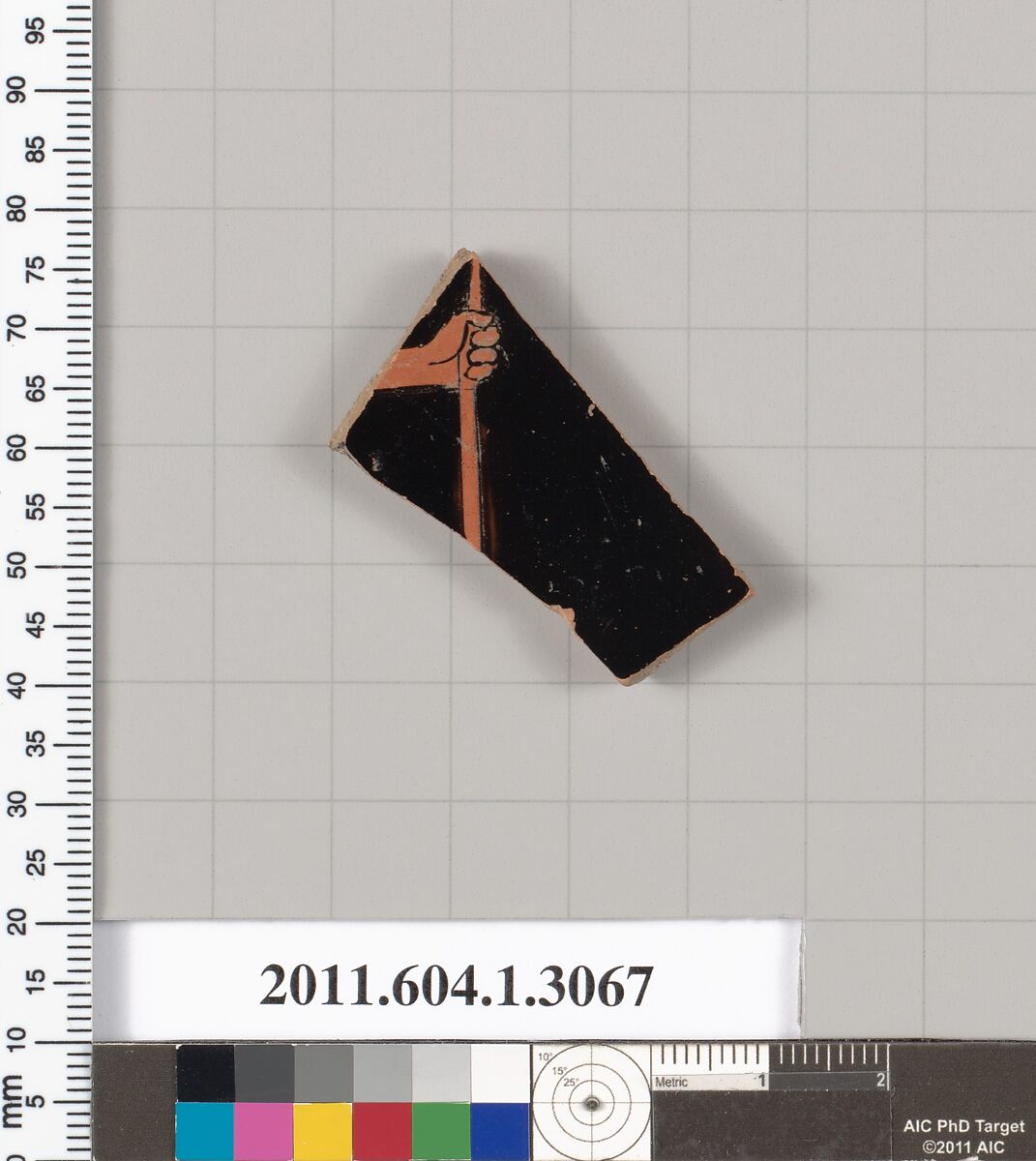 Interior, part of left forearm with hand holding staff or spear; Exterior, bit of ground line