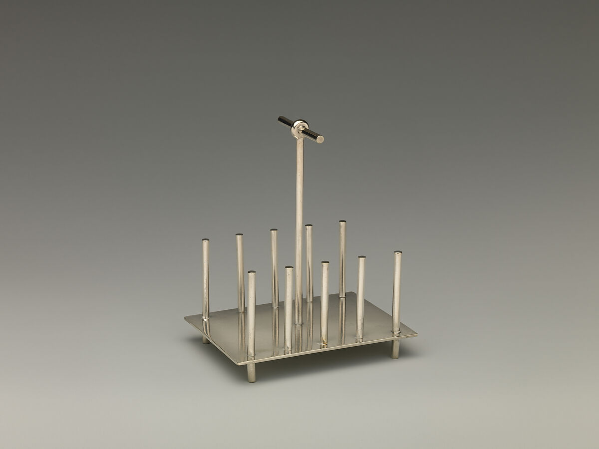Born in Glasgow, Christopher Dresser enrolled in the government-run School of Design in London in the late 1840s, where he began to pursue an interest in the relatively new field of botany. The search for a hierarchical order in the plant world was a compelling metaphor for visual harmony, and had been explored by several design theorists, among them A. W. N Pugin (1812–1852). Dresser was a student and admirer of Owen Jones (1809–1874), the designer and architect who sought to establish principals for the use of pattern and color. He was awarded an honorary doctorate for his botanical studies from Jena University (Germany), and thereafter he signed his designs (and his production pieces, including this toast rack) "Dr. Christopher Dresser." He was the first commercial designer to consistently apply his name to his productions, one of many innovative aspects of his business acumen.