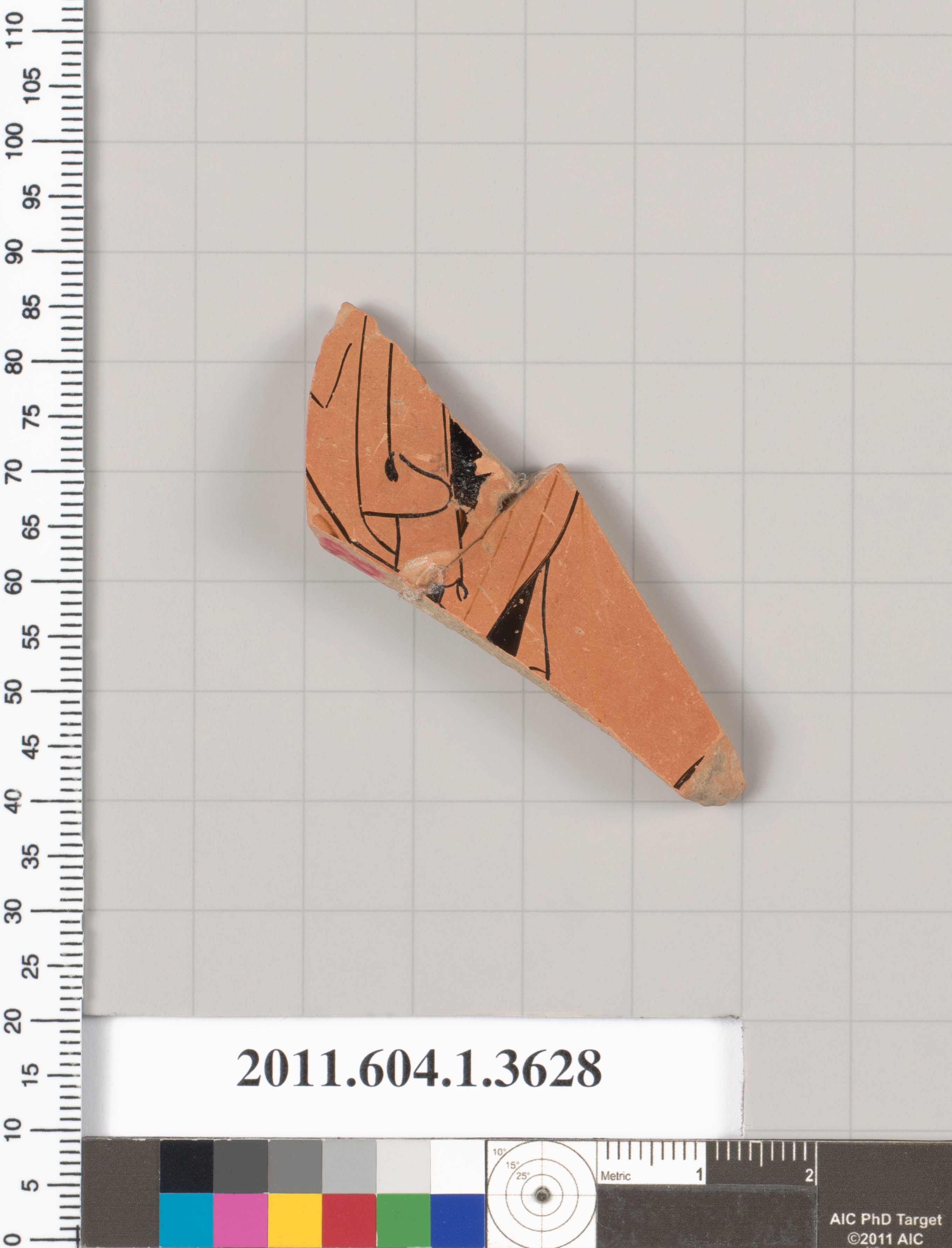 Interior, right hand holding top of staff; Exterior, part of handle palmette and tendrils