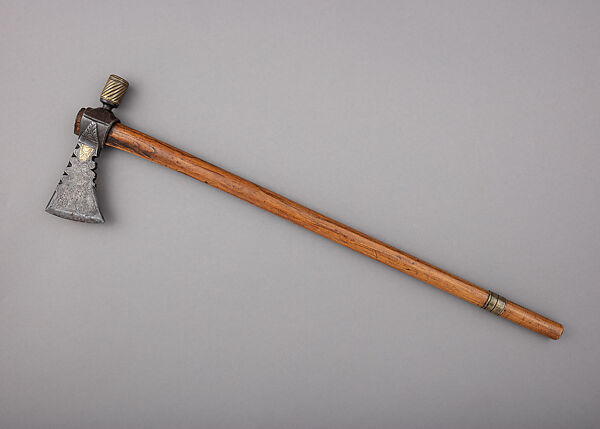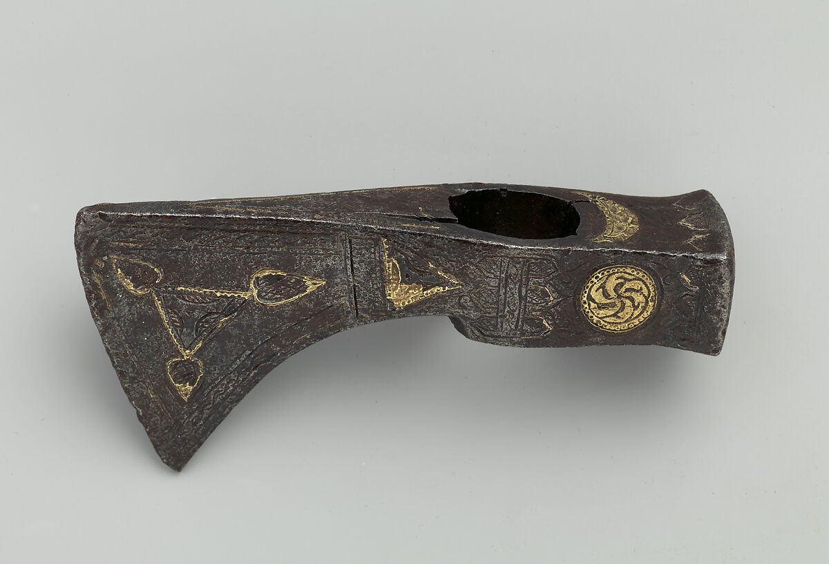 This steel head for a small axe or hatchet has a single asymmetrical blade at one end and a squared poll, or butt, at the opposite end. The top of the axe head forms a straight horizontal line from the upper corner, or toe, of the blade to the end of the poll. The bottom corner, or heel, of the cutting edge is set slightly back to form a steep point, or beard, at the base of the blade. The eye (opening for the missing haft) is slightly oval. The axe head is incised with the same decorative patterns along the length of both sides. These designs feature a triangle with a spade at each corner on the cheeks of the blade and a circle containing a whirling motif on the sides of the poll. Portions of the triangle-spade motif, the whirling motif, and other incised patterns are overlaid with copper alloy. The top of the poll and the area forward of the eye also have incised decoration, including a crescent overlaid in copper alloy at the rear of the eye. There may be traces of silver on other parts of the designs.