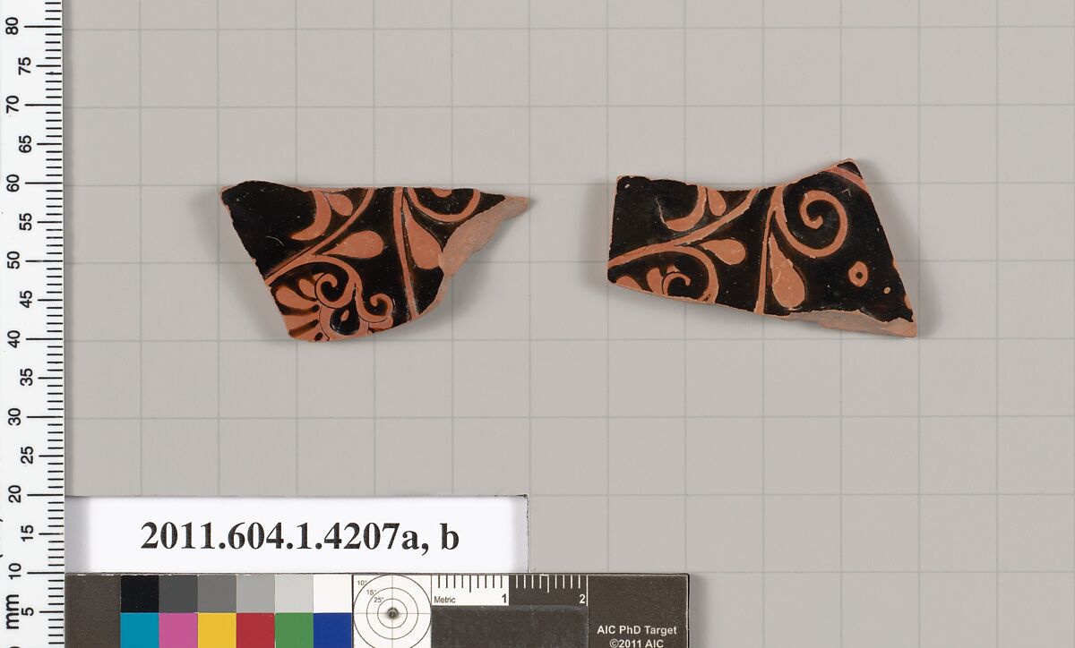 Exterior, two fragments with parts of circumscribed palmettes and tendrils