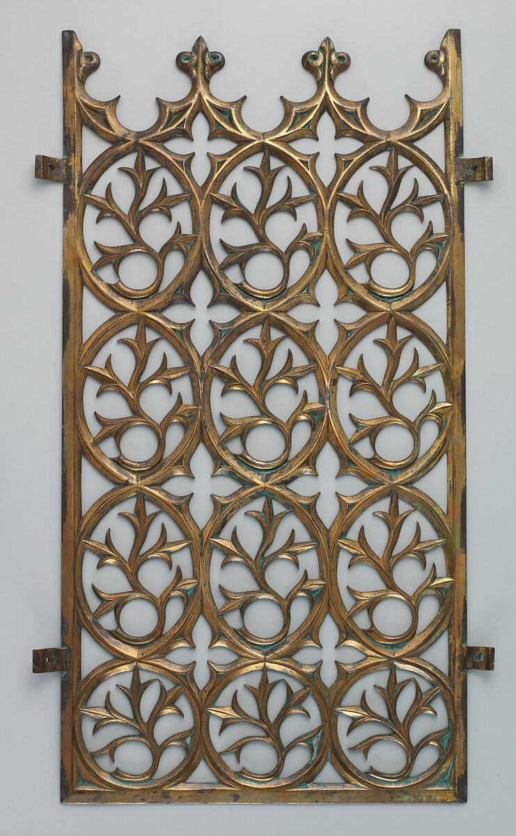 These decorative grill panels exemplify the designs of Augustus Welby Northmore Pugin (1812–1852), who was the leading exponent of the Gothic Revival style in England. Pugin’s work is central to the transformation in British design that began in the mid-nineteenth century. He admired what he saw as the honesty and purity of medieval art, and deplored the meaningless repetition of historical motifs. Pugin coined the phrase "Brumagen Gothic," referring to "those inexhaustible mines of bad taste, Birmingham."