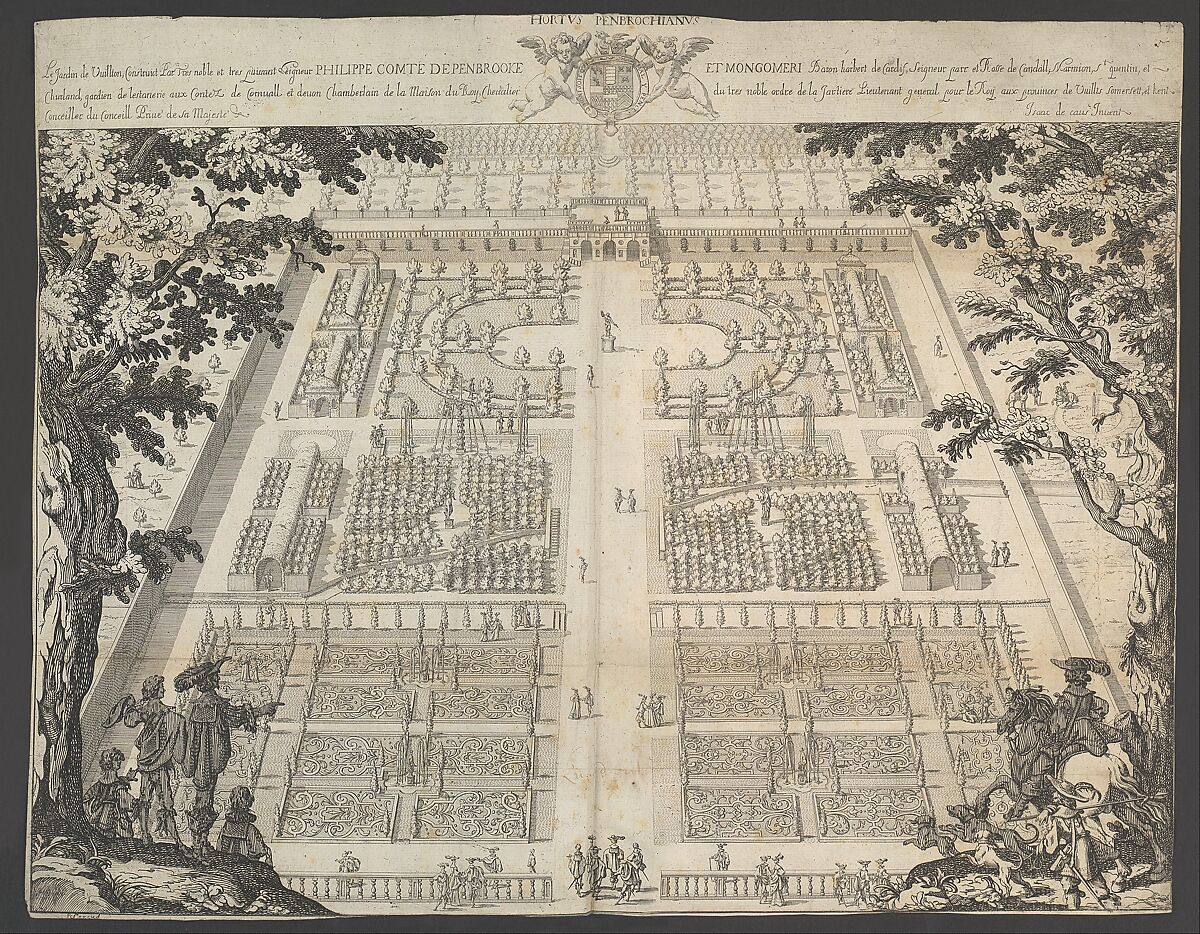In this plate, De Caus's garden view, framed by onlookers in the foreground, provides an elevated prospect of the entire geometric layout, stretching from the north, across the full length of the building facade, toward a balustraded grotto at the southern end. The strictly enclosed, rectangular layout consists of three main parts symmetrically aligned around a broad central axis. Starting with a compartment of parterres de broderie nearest the house, the middle section contains a wooded area or wilderness, usually placed at the end but in this case situated so as to hide the irregular flow of the River Nadder. The large hippodrome-shaped section comprising the third part of the garden is inspired by Greco-Roman architecture. The statues and waterworks, executed by Nicholas Stone, also follow classical Italian precepts.