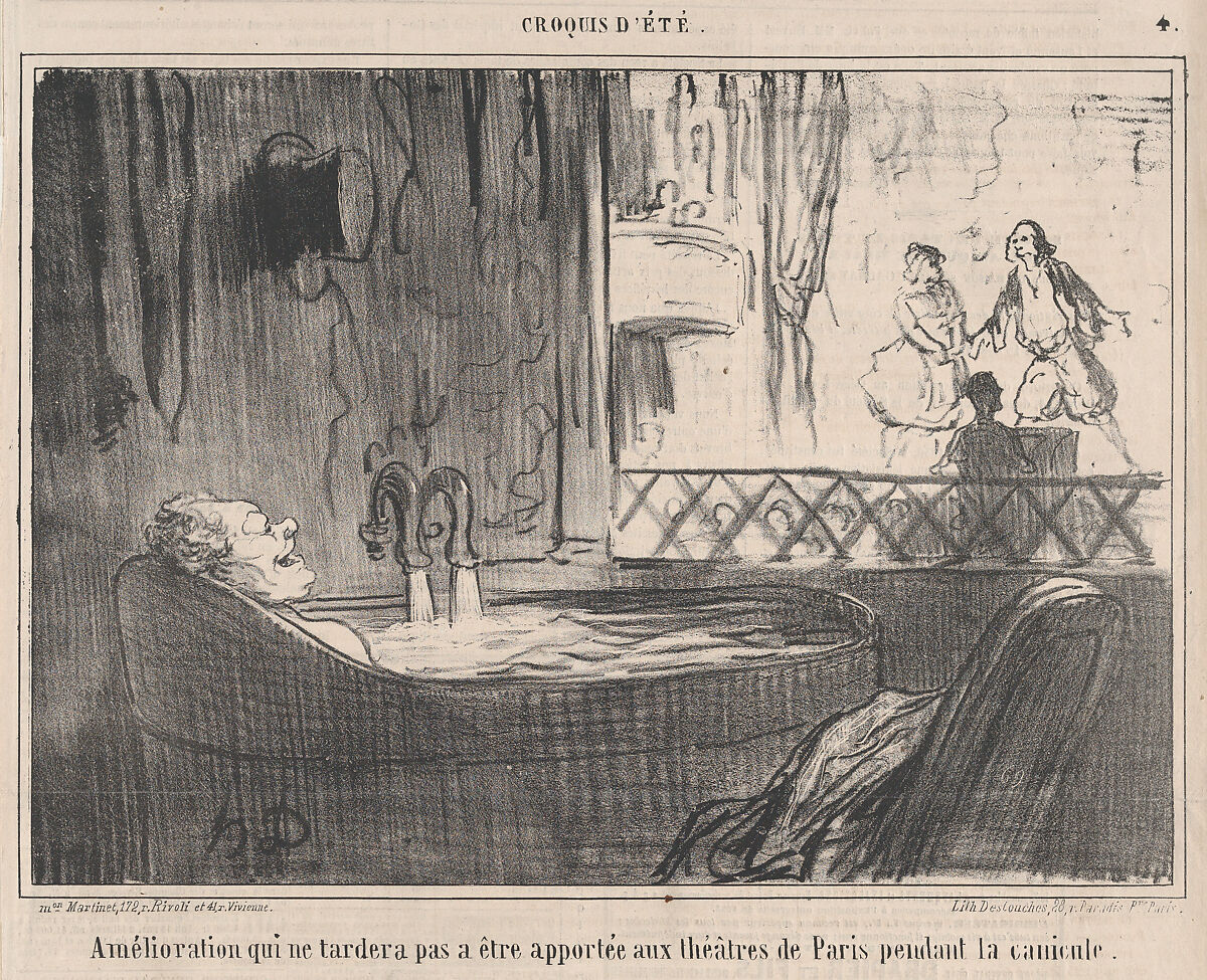 - Title: Amélioration qui ne tardera pas a être apportée aux théâtres de Paris pendant la canicule., from Croquis d'Été, published in Le Charivari, August 16-17, 1859