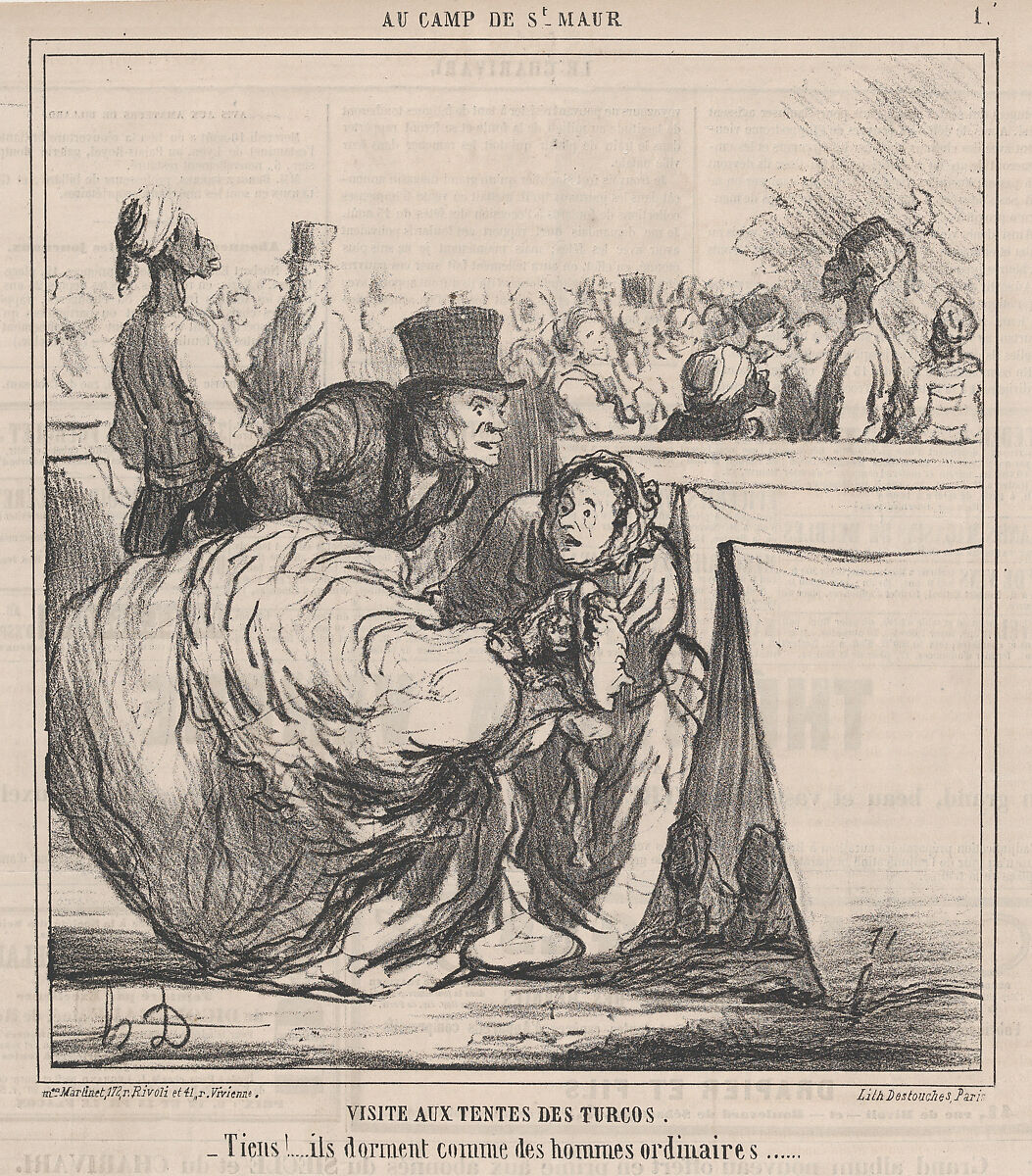 - Title: Visite aux Tentes des Turcos...., from Au Camp de Saint-Maur, published in Le Charivari, August 13, 1859