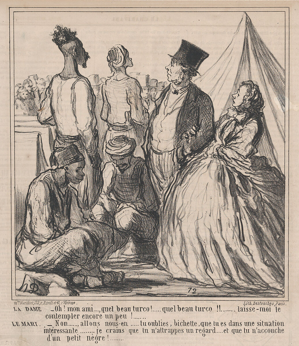 - Title: Oh! mon ami..., quel beau turco!.... quel beau turco!!...., from Au Camp de Saint-Maur, published in Le Charivari, August 15, 1859