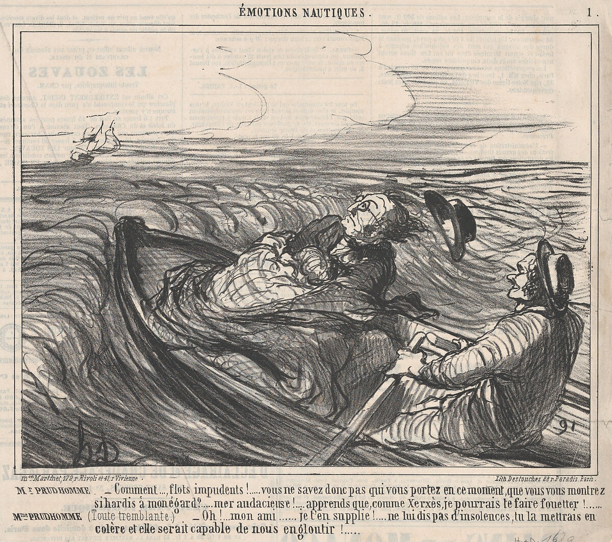 - Title:Comment..., flots impudents!... vous ne savez donc pas qui vous portez en ce moment,...., from Émotions Nautiques, published in Le Charivari, October 26, 1859
