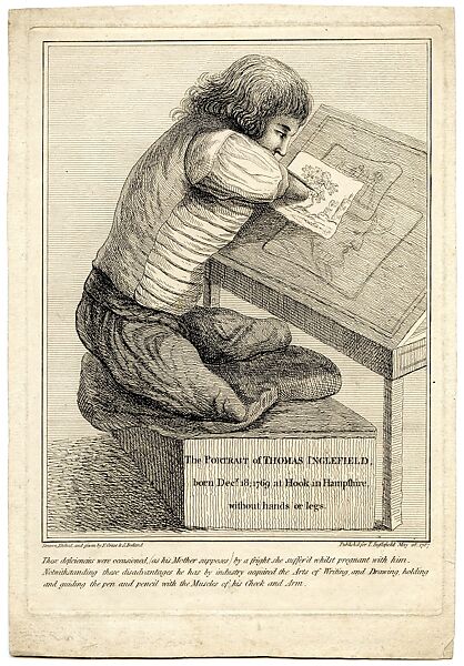 Born on December 18, 1769, in Hook, Hampshire, without hands or legs, Inglefield was one of many children born in the eighteenth century with disabilities that were blamed on a fright suffered by the mother during pregnancy. This, along with another etching of Inglefield also published and distributed by Samuel Ireland, speaks to Inglefield’s desire to fashion himself as an industrious writing and drawing master.