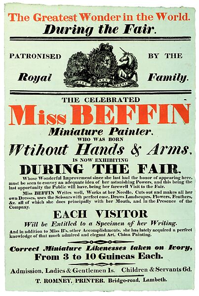 This work of art is currently on loan to the museum.Born without arms, Sarah Beffin, like Miss Honeywell, could cut and write with her mouth and was a great and peculiar attraction at the London fairgrounds. As Ricky Jay notes, this unusually large broadside was produced for her appearance at the Bartholomew Fair, a preeminent summer fair held around Saint Bartholomew’s Day (August 24) every year in London from the twelfth to the nineteenth century.