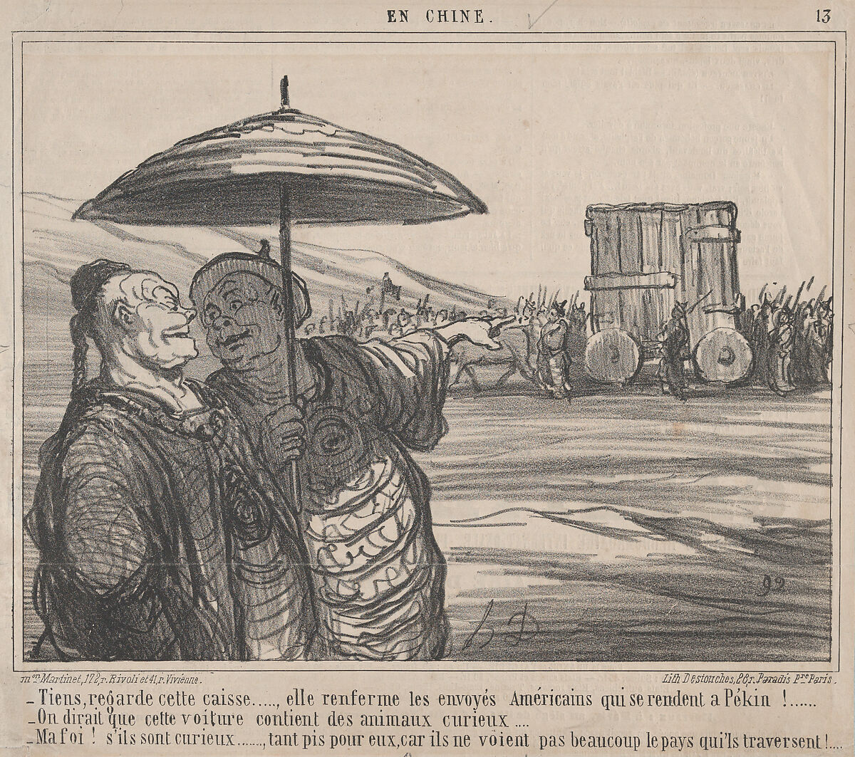 - Title: Tiens, regarde cette caisse...., elle renferme les envoyés Américains qui se rendent a Pékin!...., from En Chine, published in Le Charivari, October 4, 1859
