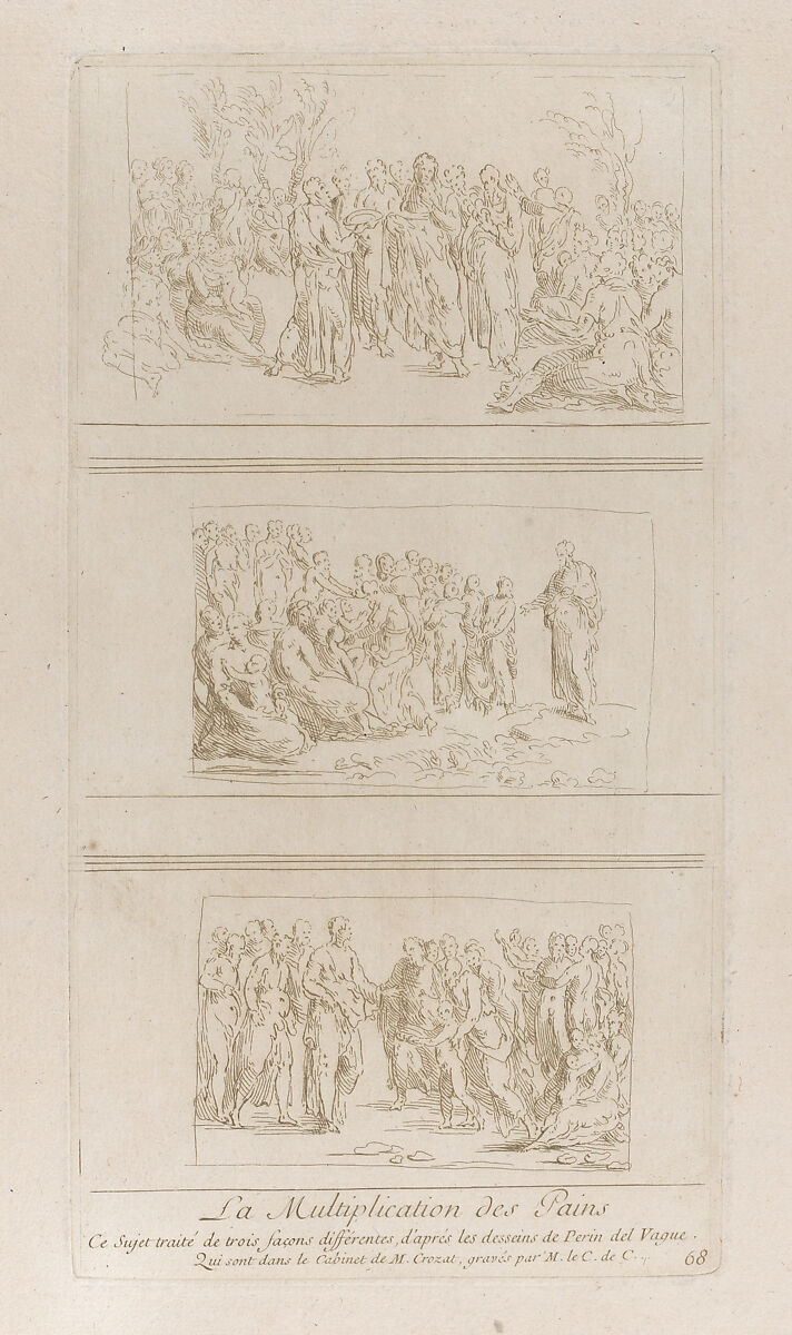- Title:Three separate studies for the miracles of the loaves, showing Christ standing in different positions surrounded by a large crowd; from 'Recueil d'estampes d'après les plus beaux tableaux et d'après les plus beaux desseins qui sont en France, Cabinet Crozat' after drawings by Perino del Vaga