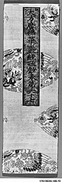 Sutras printed in the accordion-fold format were often encased by covers wrapped in decorative silks. Covers both protected the sacred words and presented the sutras in beautiful envelopes that signaled the importance of the contents within. These examples from the sixteenth century indicate the variety of sutra cover motifs, including some seemingly irrelevant to Buddhist philosophy, such as dragons, phoenixes, or the character shou, meaning longevity