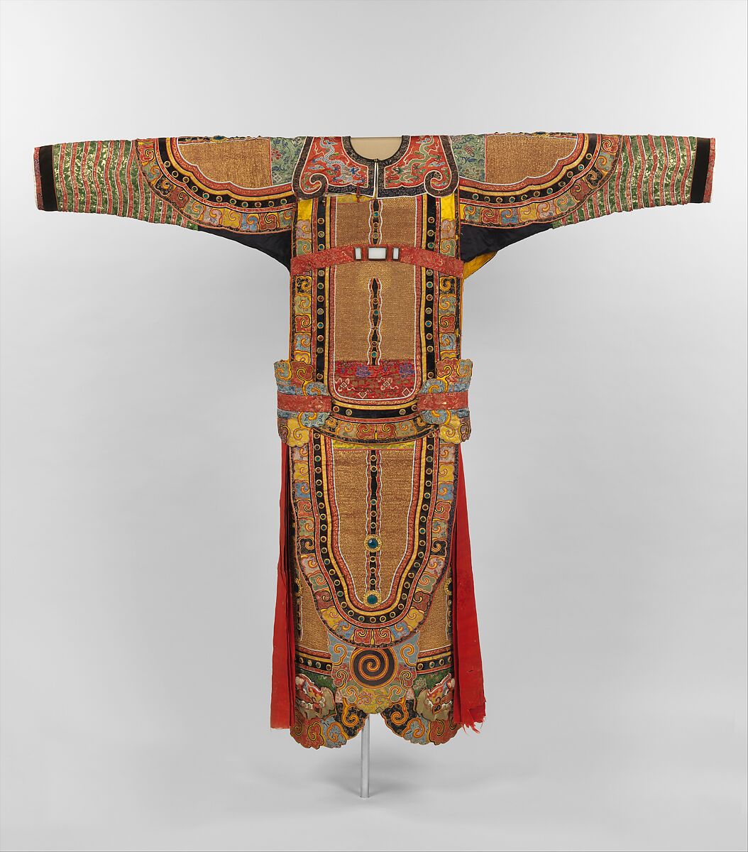 This costume is for the role of a high-ranking warrior. A nearly identical costume is in the Qing court collection of theatrical costumes in the Palace Museum, Beijing.