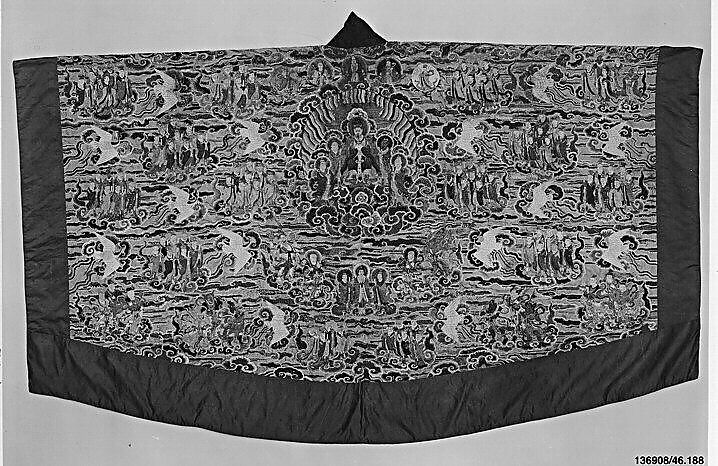 This vestment for a Daoist priest is densely embroidered with figures representing the Daoist pantheon. The deities float on clouds amid cranes in flight. The pantheon shown here had remained largely unchanged since the Yuan dynasty (1271–1368).