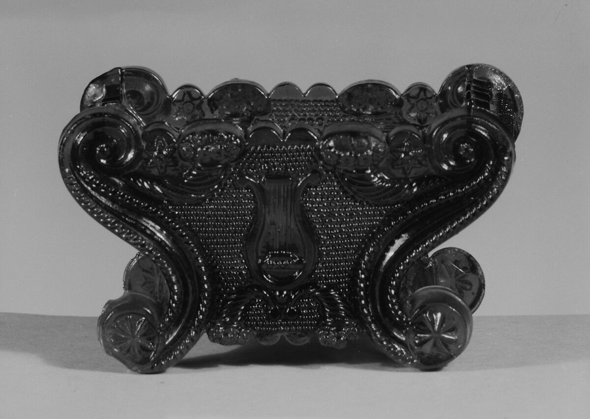 This rectangular salt dish is pressed with a centered lyre on each of its two long sides. Similar salts were made with high domed covers.