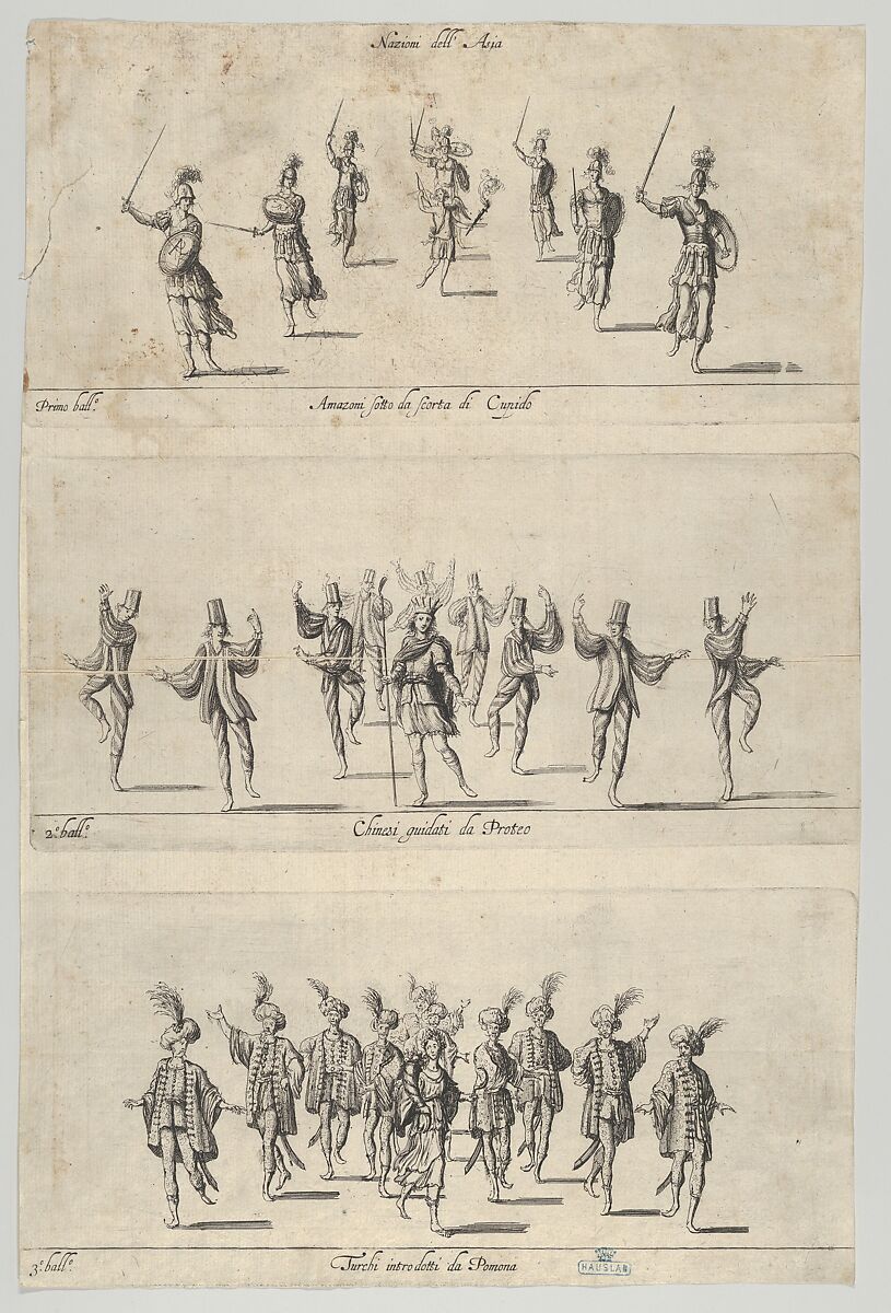 Three plates on one sheet illustrating ballets introduced by three Asian nations. The first with the representation of Cupid at center, the second with Proteus, and the third with Pomona.