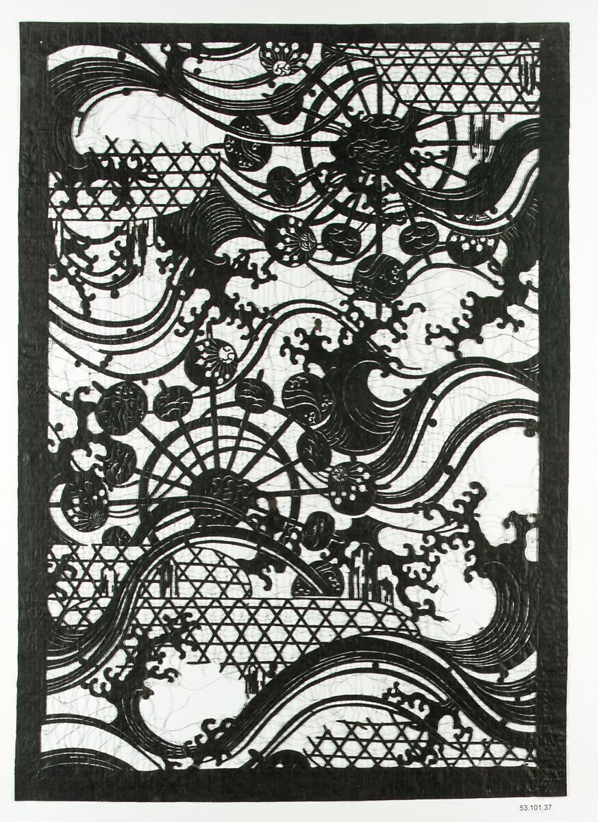 - Title: Stencil with Pattern of Flowing Water, Waterwheels and Embankment Baskets