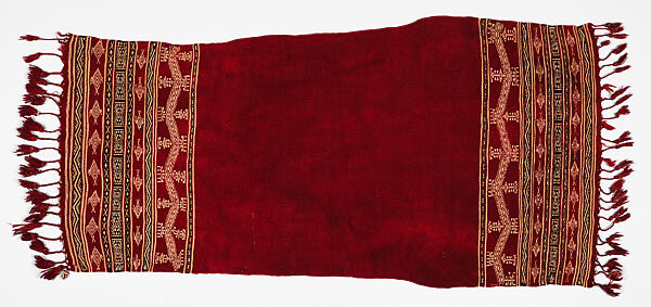 - Medium: Loom-woven plain weave cloth in wool with find geometric pattern brocaded possibly in cotton; finished with warp-twisted fringes.