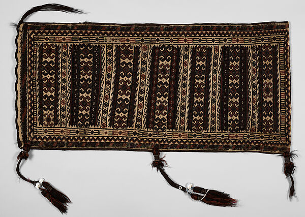 - Medium: Loom-woven flat weave cloth in wool folded and joined at the sides with overcast stitches faces of different pattern; decorated with braids