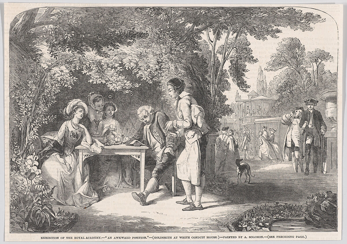 The incident shown is described by a biographer: “When [Oliver] Goldsmith resided at Islington, he sometimes extended his walks to the White Conduit House, then in the fields…While strolling one day in the gardens, he met three females of the family of a respectable tradesman, to whom he was under some obligation. He kindly conducted them about the garden, treated them to tea, and ran up a bill in the most open-handed manner imaginable; it was only when he came to pay that he found himself in one of his old dilemmas: he had not the money in his pocket. A scene of perplexity now took place between him and the waiter, in the midst of which came up some of his acquaintances, in whose eyes he wished to stand particularly well. This completed his mortification. There was no concealing the awkwardness of his position. The sneers of the waiter revealed it; his acquaintances amused themselves for some time at his expense, professing their inability to relieve him. When they had enjoyed their banter, the waiter was paid, and Goldsmith enabled to convey off the ladies."